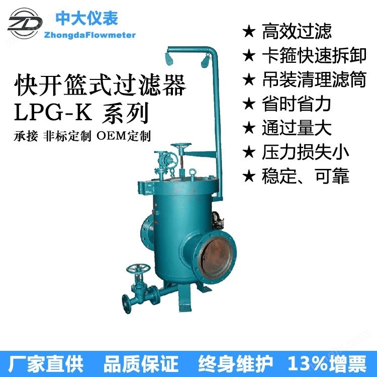 LPG-K型快開過濾器作為流量計(jì)量的輔助設(shè)備,主要作用是用來過濾被測(cè)液體中含有的顆粒雜質(zhì),以保證流量計(jì)正常運(yùn)行。與普通籃式/U型過濾器作用一樣,但是具有快速打開上蓋功能,便于清洗過濾筒。有操作方便、省時(shí)省力的特點(diǎn)。是較臟污介質(zhì)計(jì)量時(shí)優(yōu)質(zhì)的輔助設(shè)備。大口徑產(chǎn)品還可選配一體化吊裝功能,方便吊裝內(nèi)部過濾器。