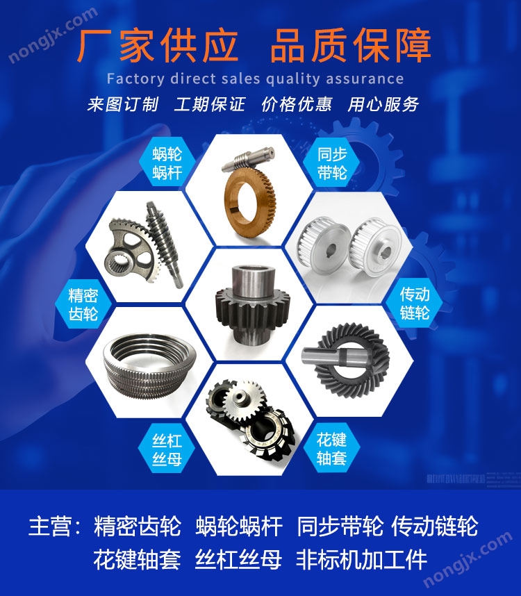 公司經營的產品有:齒輪、齒條、鏈輪、鏈條、蝸輪、蝸桿、傘齒輪、螺旋傘齒輪、同步帶輪、聯軸器、皮帶輪、多楔帶輪、花鍵軸、花鍵套、萬向節、錐套等傳動件,同時,本公司可以根據客戶要求來設計加工非標規格的產品,公司產品廣泛應用于旋轉壓片機,碼垛機,焊接設備,食品機械,包裝機械,灌裝機械,輸送機械,數控機床,機器人等自動化生產線。