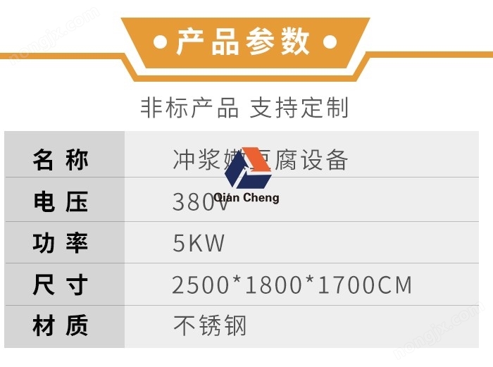 仟程機(jī)械沖漿豆腐機(jī)又稱(chēng):板式豆腐、箱式豆腐、嫩豆腐、水豆腐。新型沖漿豆腐機(jī)是宏金機(jī)械研發(fā)團(tuán)隊(duì)根據(jù)自身多年研發(fā)經(jīng)驗(yàn),總結(jié)市場(chǎng)反饋信息,自行研制的自動(dòng)化生產(chǎn)嫩豆腐的一款自動(dòng)設(shè)備,仟程機(jī)械二十六年豆制品機(jī)械生產(chǎn)經(jīng)驗(yàn),所售產(chǎn)品均為廠(chǎng)家直供,沖漿豆腐機(jī)結(jié)構(gòu)科學(xué),設(shè)計(jì)新穎,融入新鮮科技元素,一鍵可控!板式豆腐/沖漿豆腐生產(chǎn)線(xiàn)點(diǎn)漿桶、儲(chǔ)漿桶、自動(dòng)沖漿機(jī)、自動(dòng)送箱機(jī)、自動(dòng)翻箱機(jī)、自動(dòng)回箱機(jī)于一體,減少了人工操作,產(chǎn)量口感好。