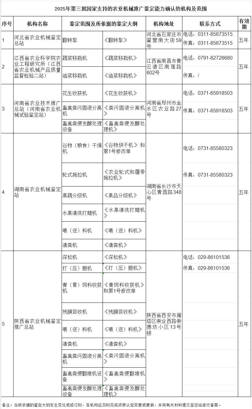 2025年第三批國家支持的農業機械推廣鑒定承擔機構能力確認范圍公布
