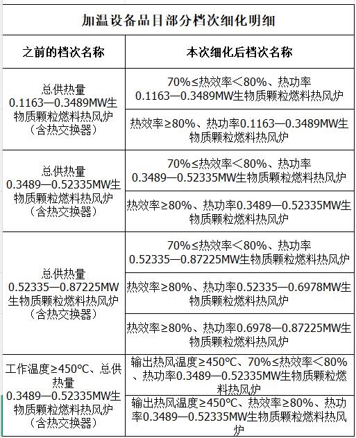 二、部分優化調整的檔次需要重新投檔。“總供熱量0.1163—0.3489MW生物質顆粒燃料熱風爐(含熱交換器)”“總供熱量0.3489—0.52335MW生物質顆粒燃料熱風爐(含熱交換器)”“總供熱量0.52335—0.87225MW生物質顆粒燃料熱風爐(含熱交換器)”“工作溫度≥450℃、總供熱量0.3489—0.52335MW生物質顆粒燃料熱風爐(含熱交換器)”4個檔次進行了細化(具體見下表),之前已投檔通過列入上述4個檔次的產品,需要重新投檔到相應檔次后,2025年12月31日及之后購置的農機具才能享受補貼。除上述4個檔次外本次優化調整的其他檔次,之前已投檔通過的產品不需要重新投檔。