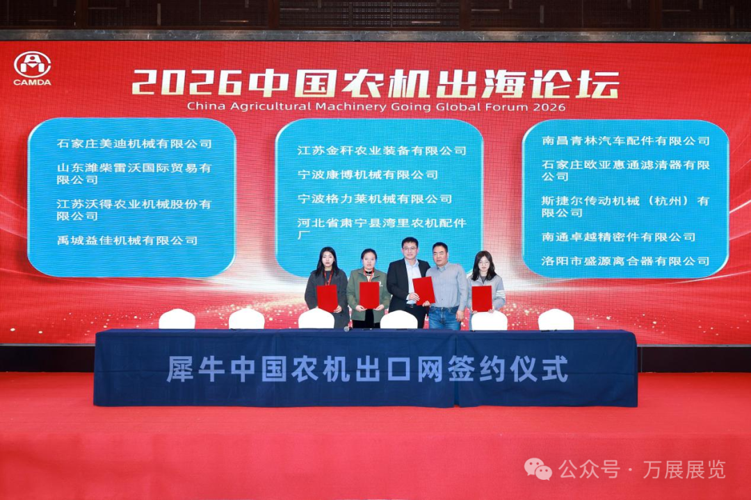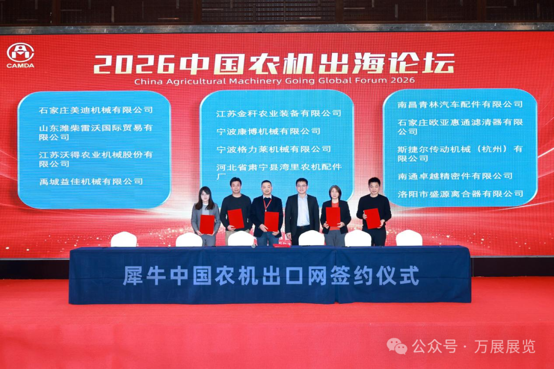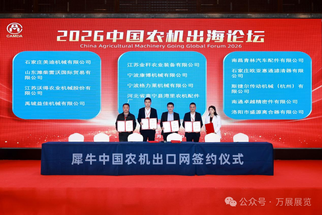 值得一提的是,2026年1月1日,萬展展覽正式上線境外農(nóng)機產(chǎn)品線上外貿(mào)平臺——犀牛中國農(nóng)機出口網(wǎng)。據(jù)程世強介紹,截至2026年3月1日,預(yù)計有200家中國農(nóng)機企業(yè)產(chǎn)品上線平臺,其上線標(biāo)志著萬展展覽已突破純線下展會的宣傳局限,可通過線上渠道助力更多中國農(nóng)機企業(yè)跨越時間、地域與成本壁壘,向全球精準(zhǔn)展示產(chǎn)品、拓展海外市場。論壇現(xiàn)場,包括山東雷沃、江蘇沃得、石家莊美迪、禹城益佳、江蘇金稈、寧波康博、寧波格力萊、河北灣里農(nóng)機、南昌青林汽配、歐亞惠通、斯捷爾傳動、南通卓越、洛陽盛源等13家企業(yè),與犀牛中國農(nóng)機出口網(wǎng)簽訂了合作意向。