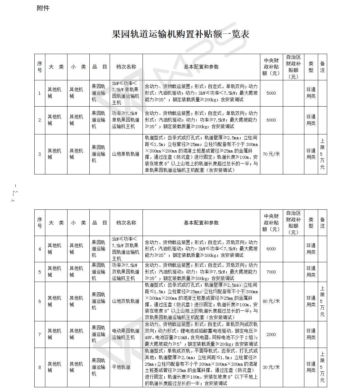 廣西關于對果園軌道運輸機購置補貼額一覽表進行調整的公示