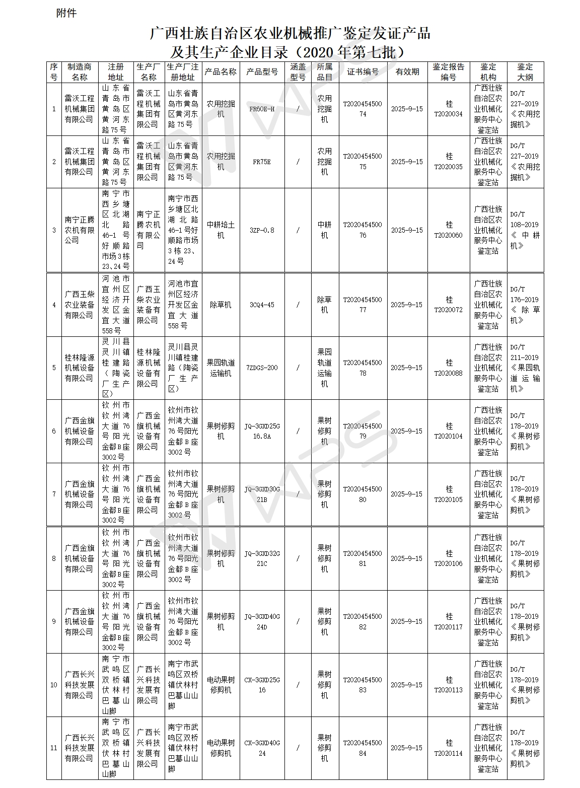 附件:廣西壯族自治區(qū)農(nóng)業(yè)機(jī)械推廣鑒定發(fā)證產(chǎn)品及其生產(chǎn) 企業(yè)目錄(2020年第七批)