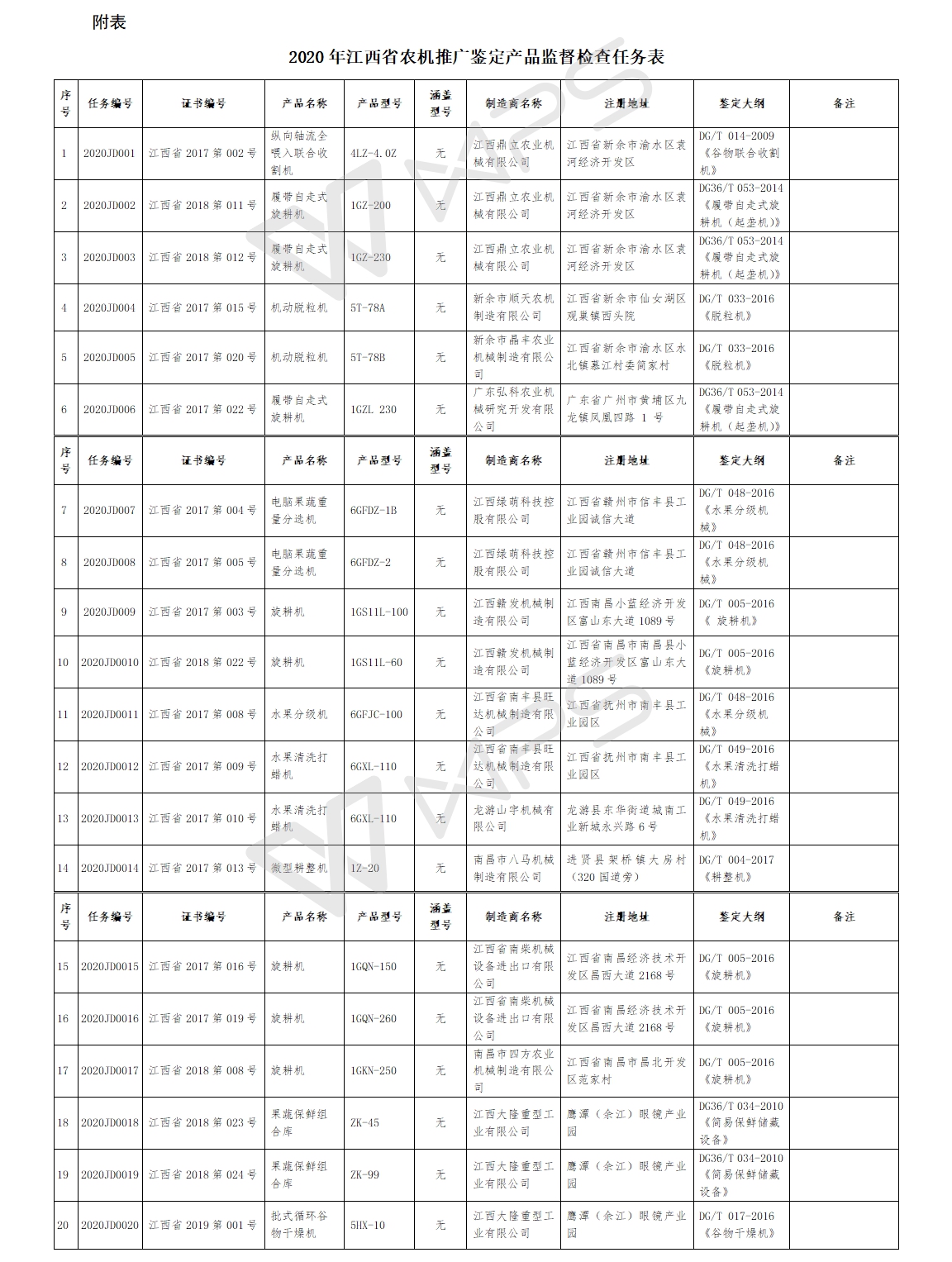 附件:2020年江西省農機推廣鑒定產品監督檢查任務表
