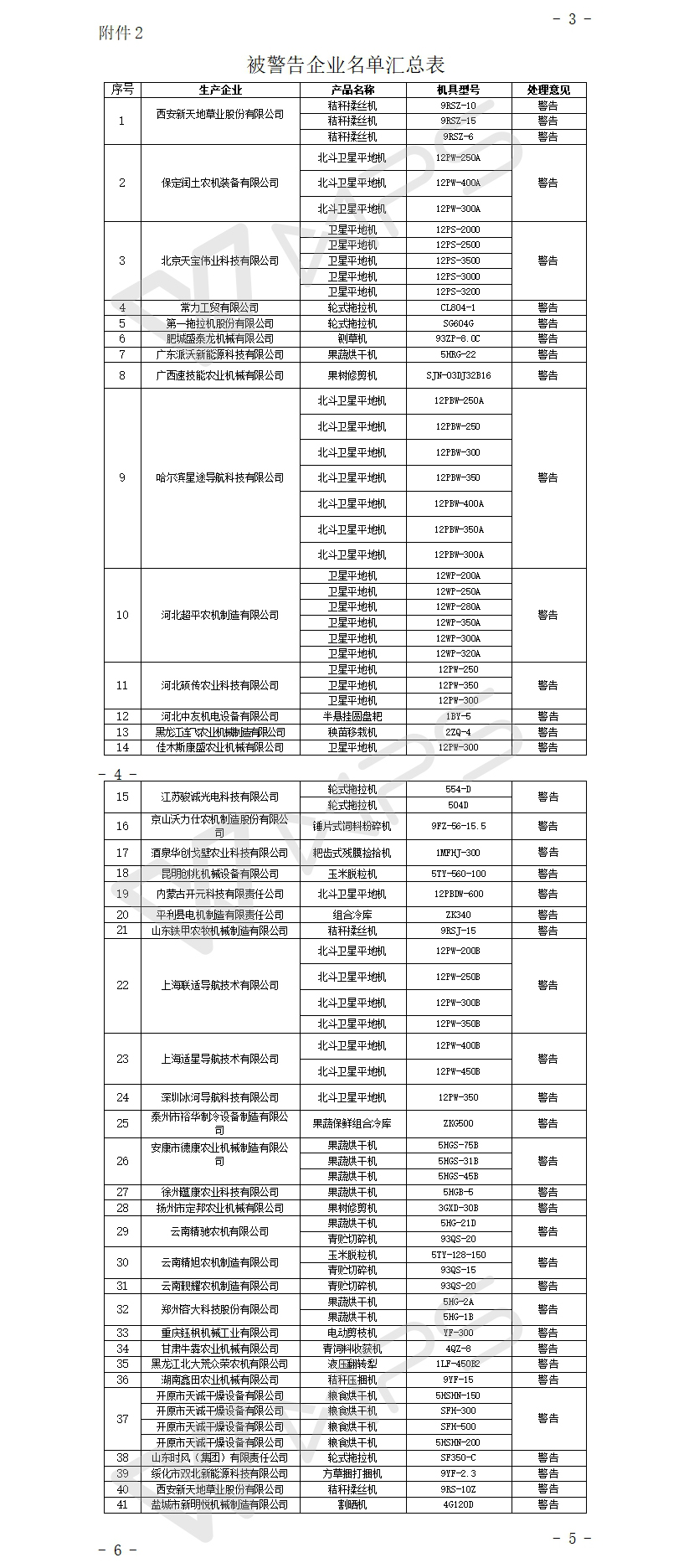 二、對黑龍江北大荒眾榮農機有限公司、保定潤土農機裝備有限公司等41家企業給以警告