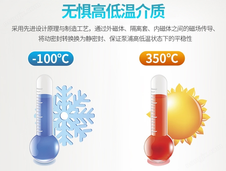 磁力驅(qū)動(dòng)式熱油離心泵為磁力驅(qū)動(dòng)式高低溫離心泵,移送循環(huán)介質(zhì)為不含顆粒、纖維的液體。泵浦外觀設(shè)計(jì)新穎、振動(dòng)小、噪音低、無泄漏。泵浦可循環(huán)水、導(dǎo)熱油、乙二醇、硅油、酒精、碳?xì)淙芤旱冉橘|(zhì),泵浦耐溫范圍:-80℃~+350℃。并可根據(jù)客戶需求,定制變頻、防爆、特殊電源等電機(jī)。
